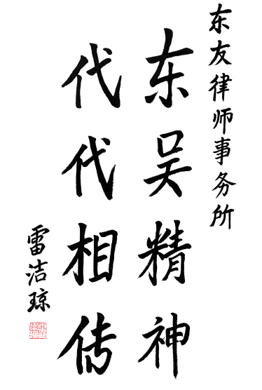 1996年,北京市东友律师事务所在东吴大学北京校友会的倡议和支持下成立,以东吴大学校训“养天地正气,法古今完人”作为东友所训,“东友”即东吴校友的简称,由雷洁琼委员长提字“东友律师事务所”,为勉励东友人发扬东吴精神,雷老又题写“东吴精神,代代相传”的墨宝。随后,倪征燠老师为东友题写赠语”法界俊彦“,杨铁樑大法官也为东友题写了赠言。东吴校友、法学教授、最高人民法院原局级审判员、中国国际经济贸易委员会仲裁员沈关生先生担任东友名誉主任。